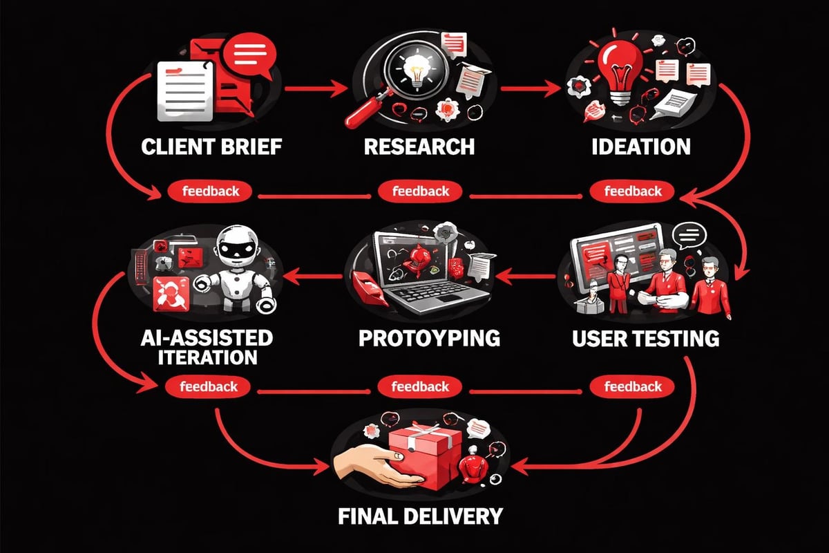 AI enters this workflow during step three. Instead of manually creating every variant, the studio uses AI to generate structural alternatives while maintaining brand consistency. The designer's role shifts from pixel-pushing to strategic curation.