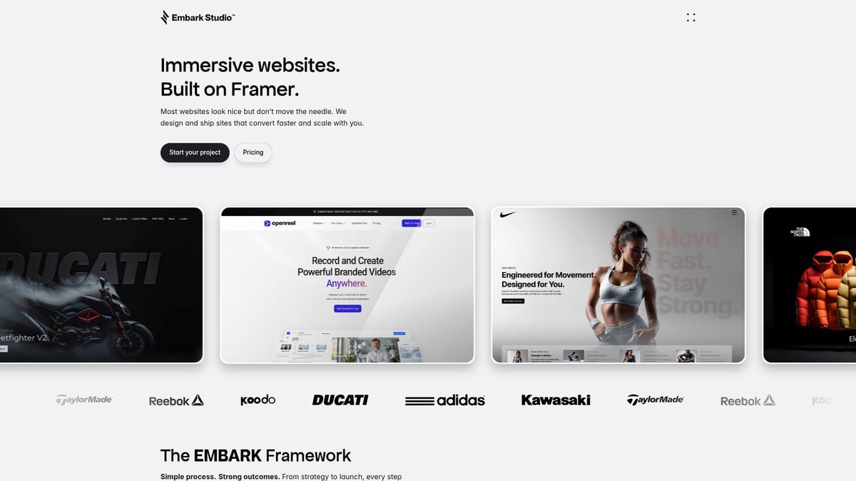 Embark Studio™ brings a proprietary, async process to figma to framer handoffs, powered by Framer and Slack-native feedback. Their approach enables startups to launch conversion-focused products rapidly, with expert-level implementation at every step.