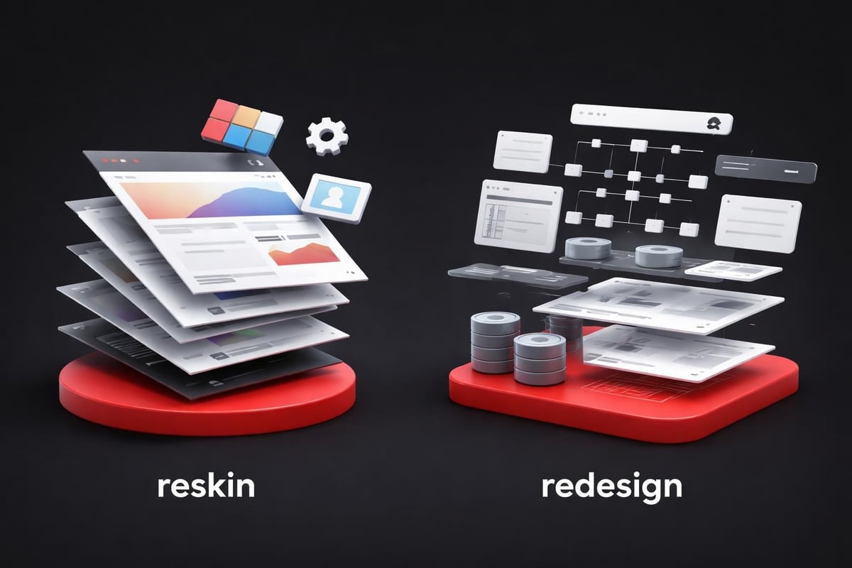 This distinction matters because it defines scope, timeline, and budget. A reskin typically takes 4-8 weeks instead of 4-6 months. It costs 30-50% of a full redesign. And it carries significantly less technical risk.